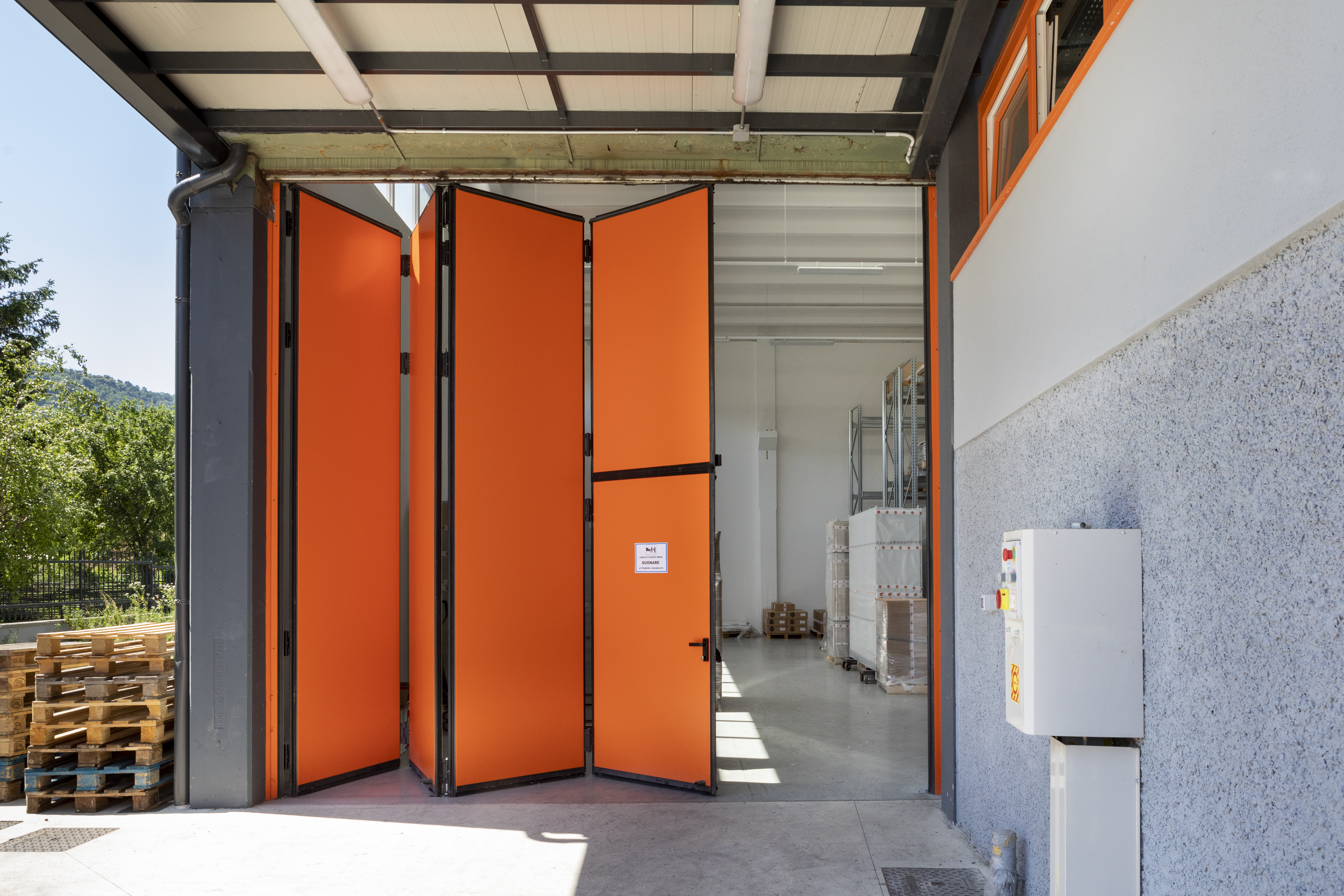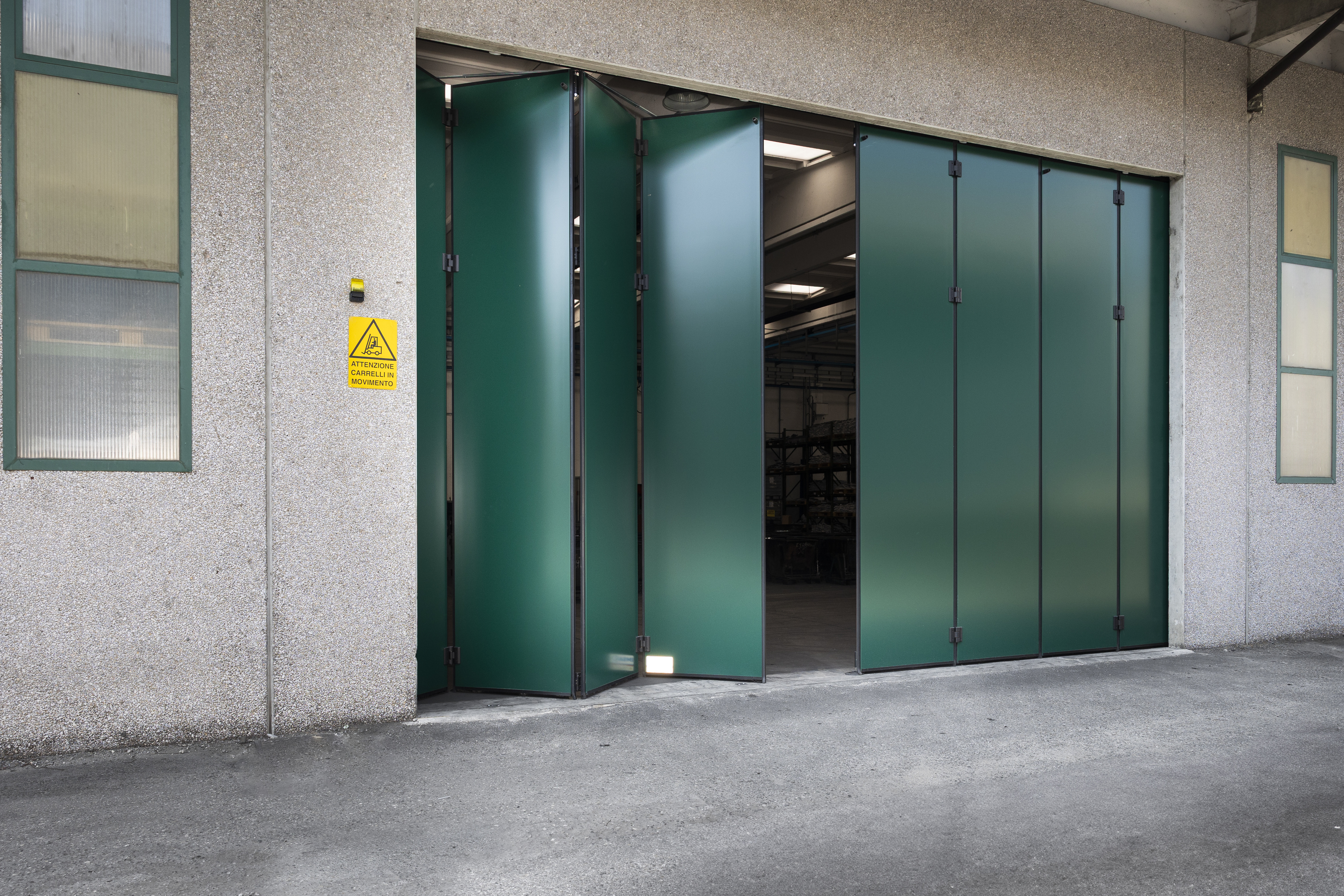 I PORTONI A LIBRO sono porte che si aprono lateralmente ripiegandosi su se stesse. Possono essere ad unico o a doppio impacco, con sistema di apertura e chiusura motorizzato.